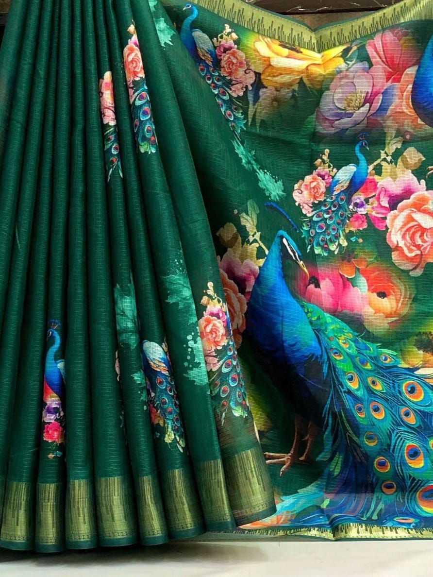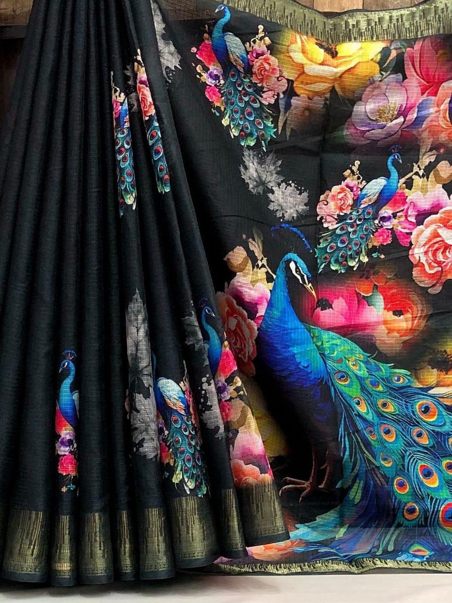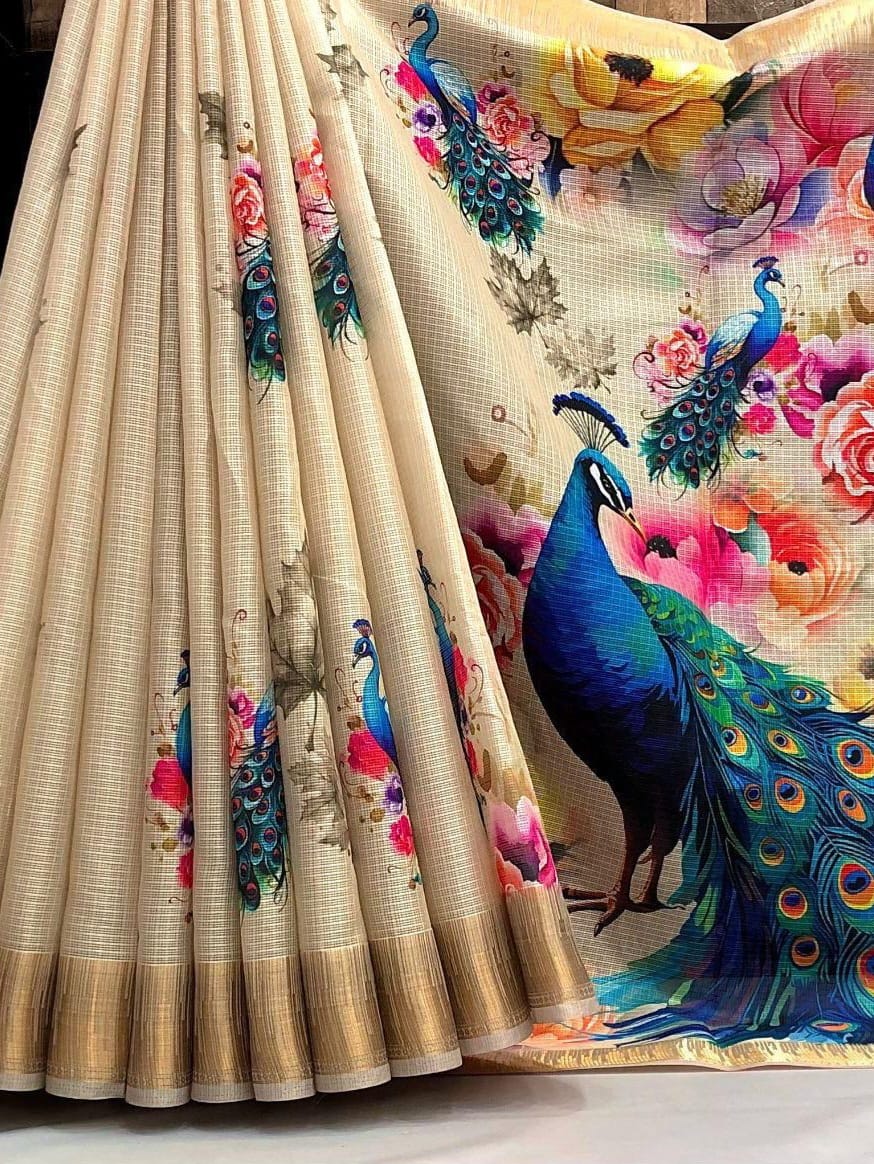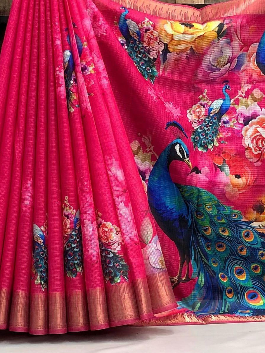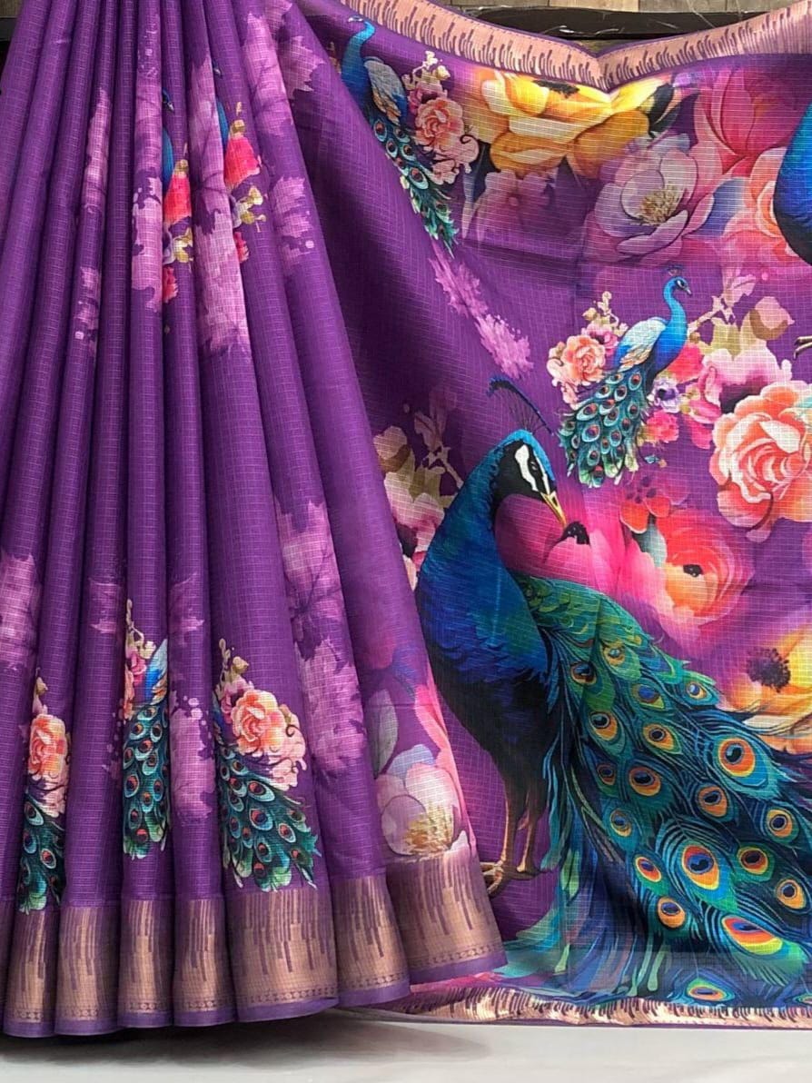 Fabric - Soft kota chex peacock design digital print with temple design weaving border